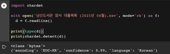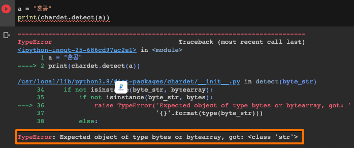 - chardet.detect를 사용하려면, bytes or bytearray 타입으로 형변환이 필요합니다.