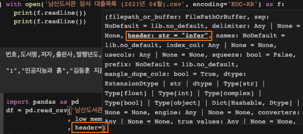 ① header 매개변수의 기본값은 1로 csv파일의 첫번째 열 이름으로 사용합니다.