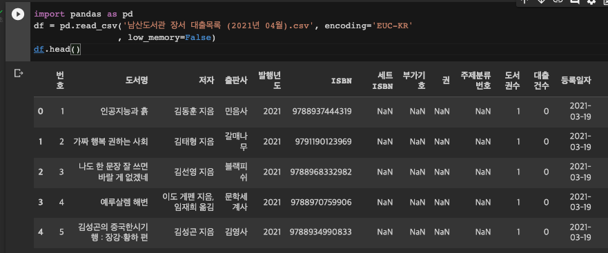 ☞ p. 71 ~ 73 남산 도서관 데이터를 코랩에서 데이터프레임으로 출력하고 화면 캡처하기