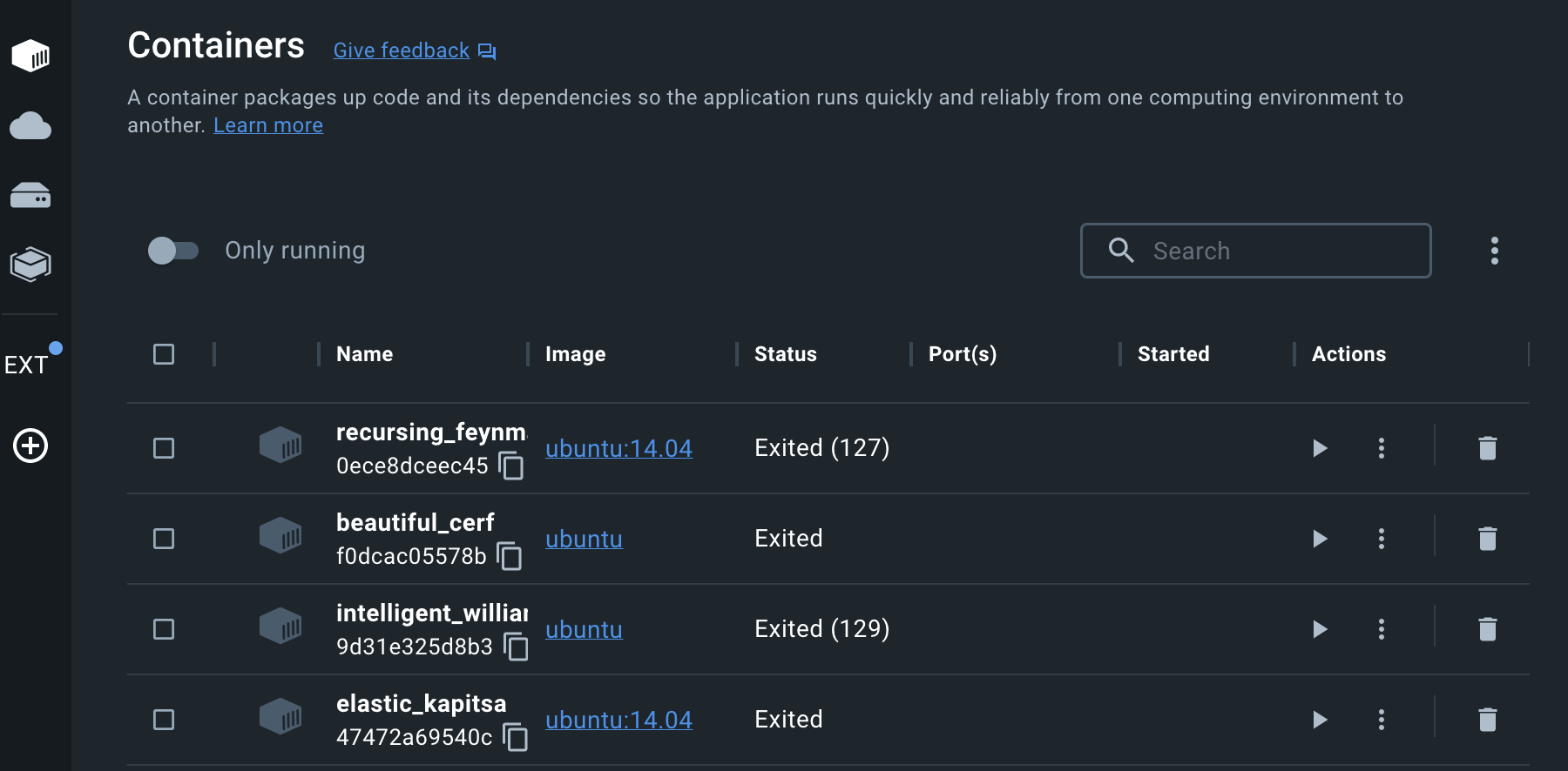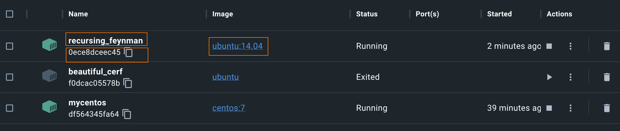 - 아래 그림 (docker desktop)에서 보이는 Name을 이용하거나, 고유 해쉬값을 이용하면 가능