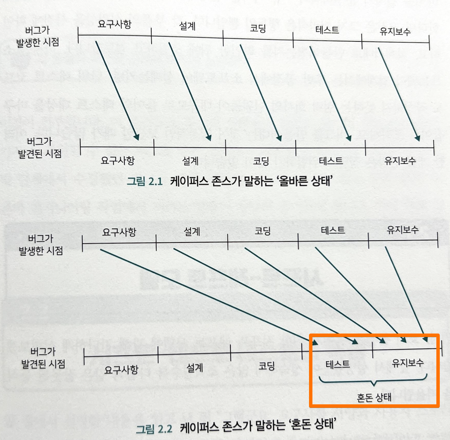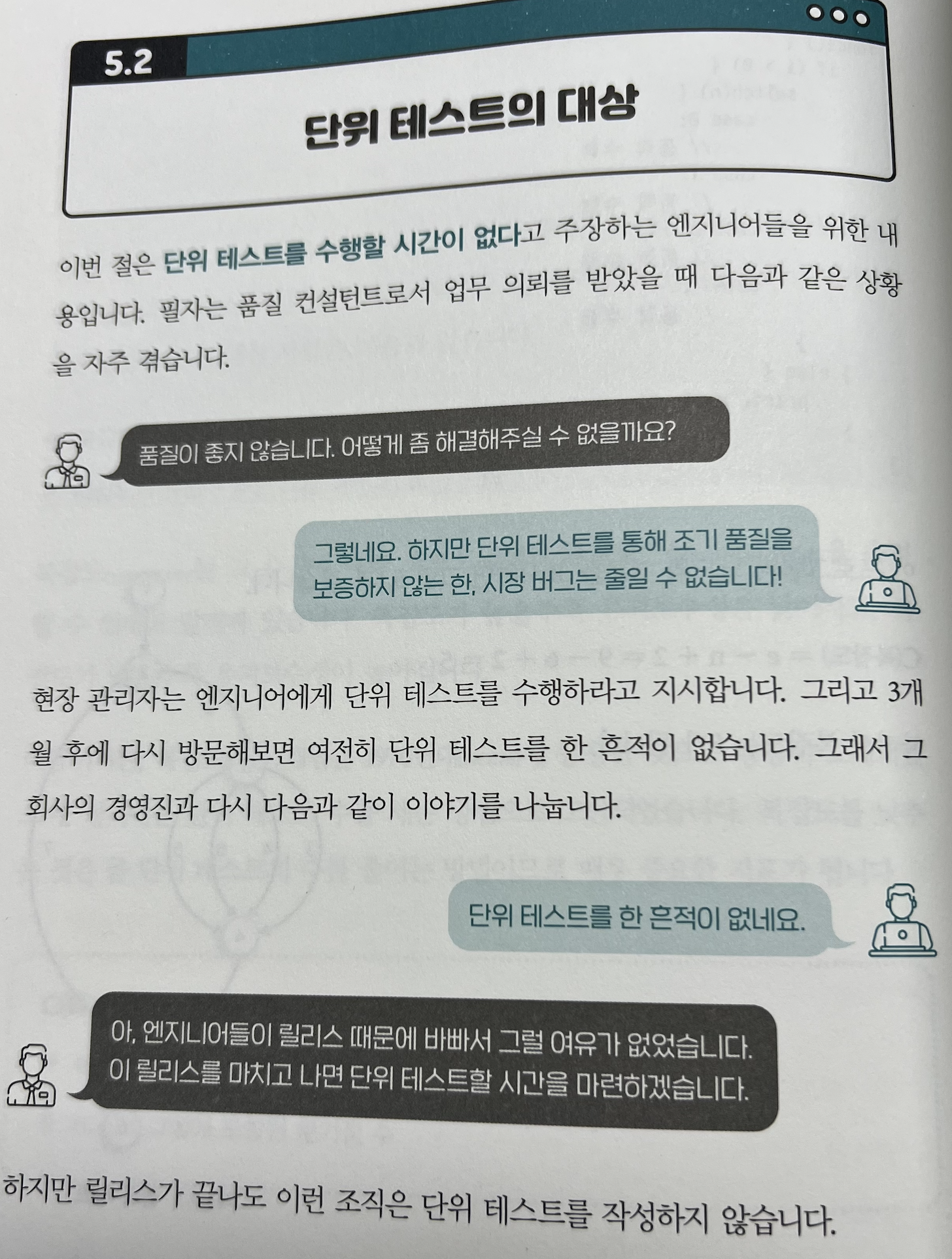 역자는 "개발활동 주체"와 "품질활동 주체"가 분리되어 있으며, 개발활동 주체가 발견할수 있는 오류의 영역과, 품질활동 주체가 발견할수 있는 오류의 영여깅 전혀 다르다고 정의합니다.