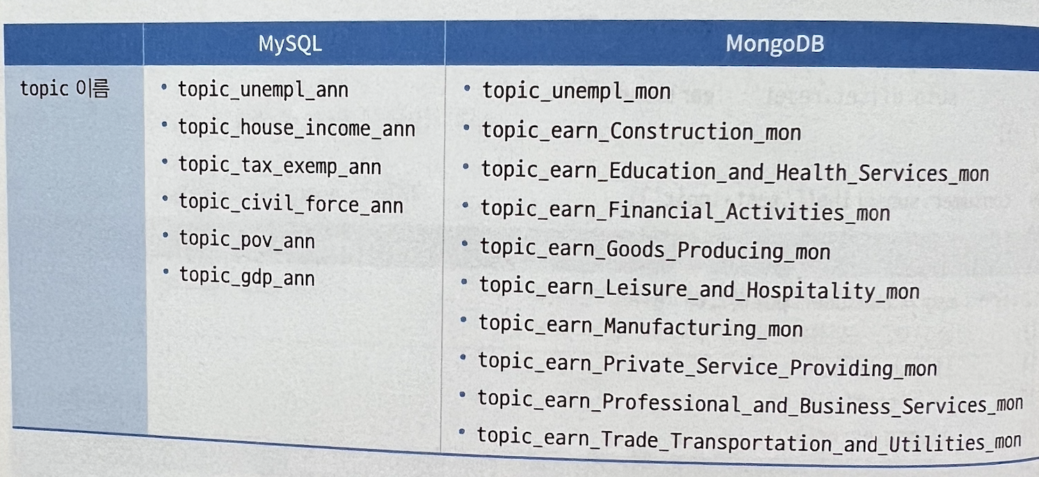 (kafka에서 토픽으로 아래와 같이 정의를 하여서 구성하는 예시입니다.)