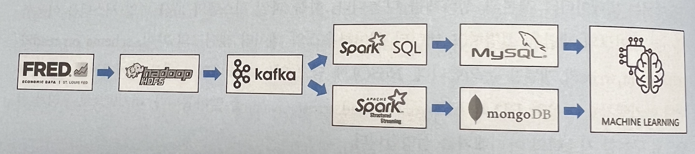 맨 앞에서 있는 FRED(Federal Reserve Economic Data)는 미국 세인트루이스 연방준비은행에서 관리하고 제공하는 경제통계 시계열 데이타를 의미합니다. 이 데이터를 가지고 아래의 기술요소들을 순차적으로 목적에 맞게 활용하는 실습을 해볼수 있게 책이 구성되어 있습니다. 아래의 기술요소들은 모두 각각의 책으로 구성되고, 하나하나 별로 큰 주제임은 분명합니다.