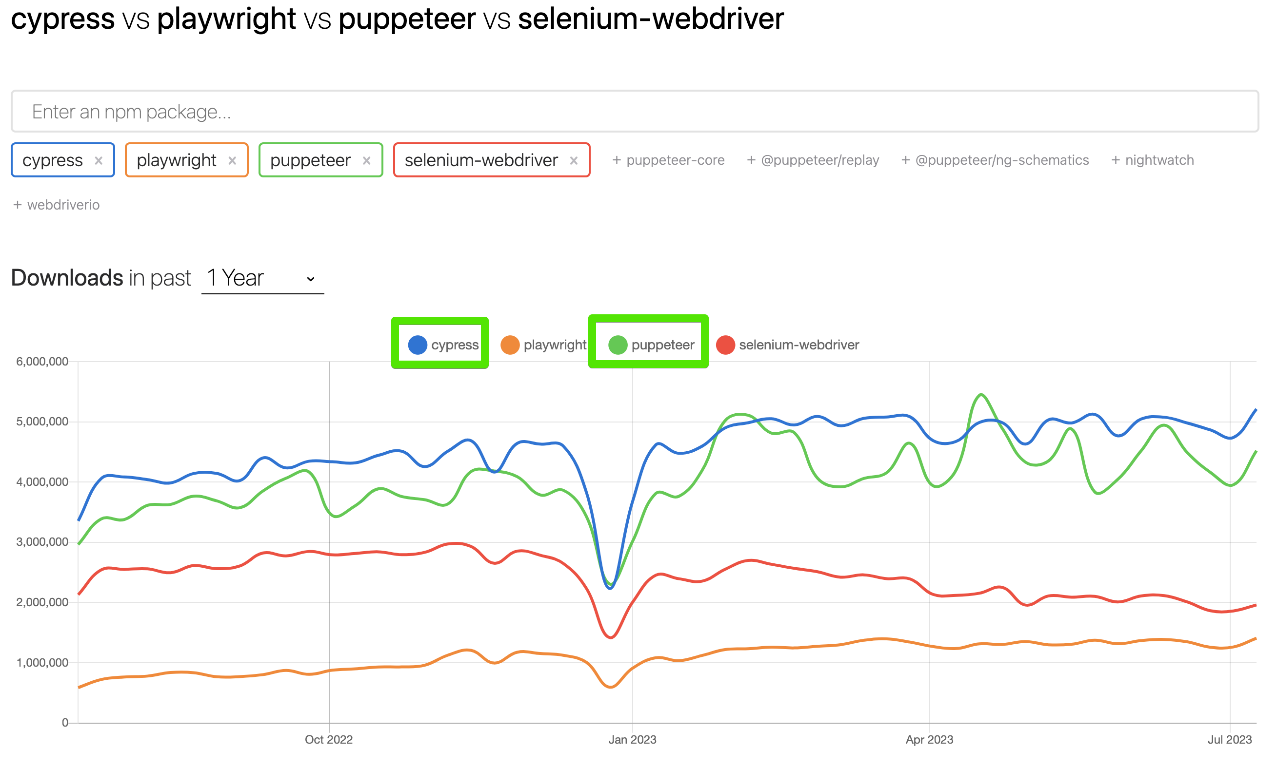 1년 기준으로 사용빈도를 조회해보면, cypress와 puppeteer가 가장 많이 사용되는것을 볼수 있다.