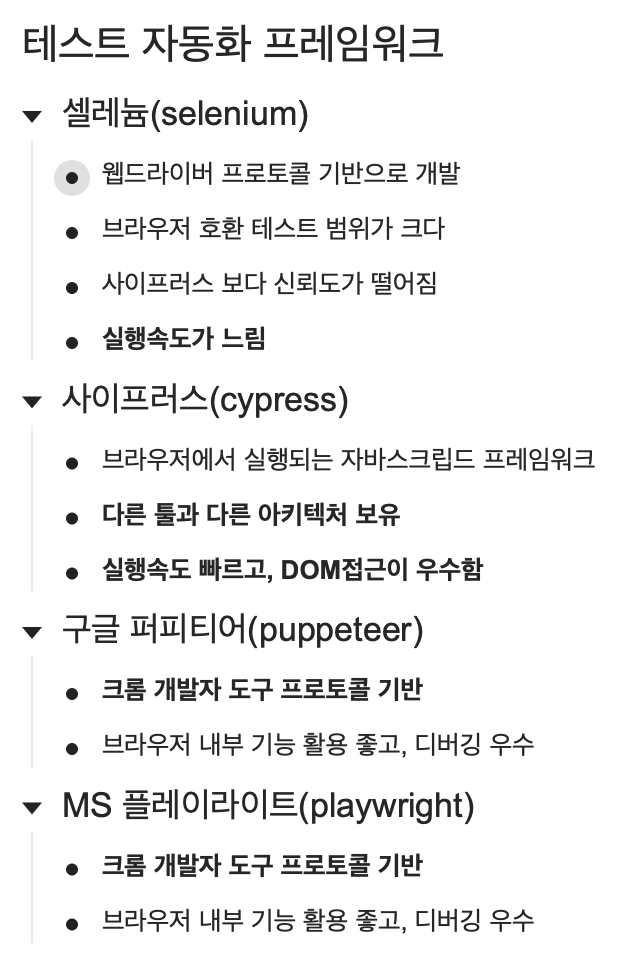 - 프레임워크 4대장 소개 : p.37의 내용인데 위사항만 보면 처음으로 시도해볼만한 프레임워크는 cypress가 눈에 들어온다.