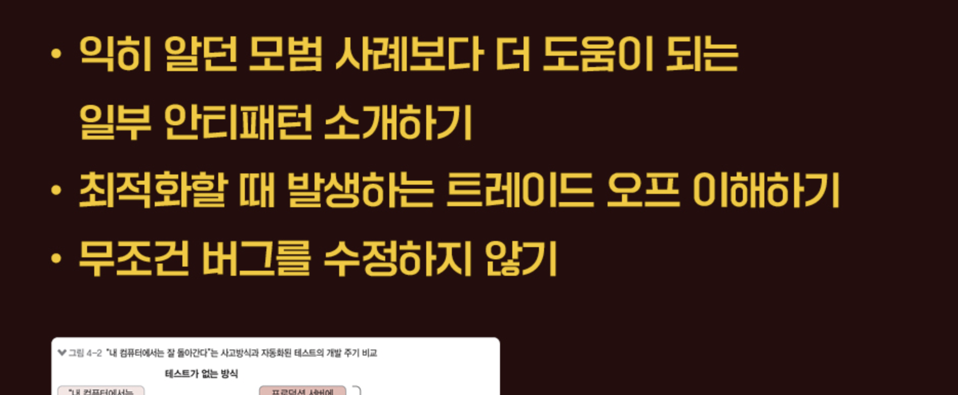 우리는 보통 TDD를 이야기 합니다. 그런데 여기서 다루는 항목에서 TDD, BDD와 같은 용어 피하기는 어떠한 다른 시작을 제공하는 것일까요? 테스트가 누구나 필요하다고 생각하지만, 쉽게 접근하지 못하는 부분도 있는데 조금은 현실적인 조언 및 가이드로 구성되어 있지 않을까 생각합니다.