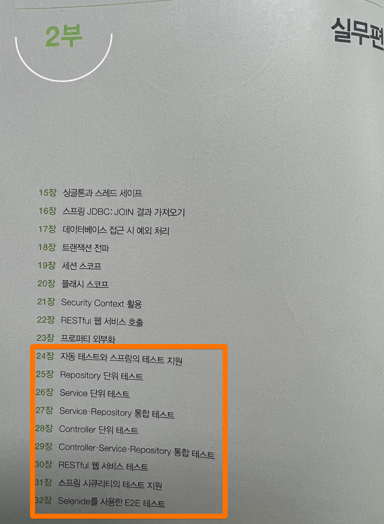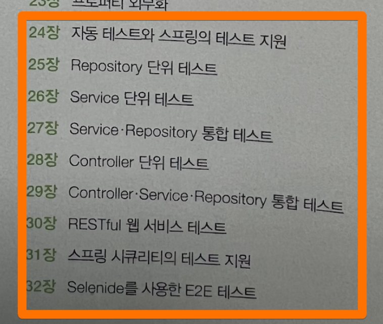 특히 테스트 부분에 대해서 많은 부분이 할애되어 있어서, 일반 스프링책에는 없는 관점으로 다양한 chapter를 구성하고 있습니다.