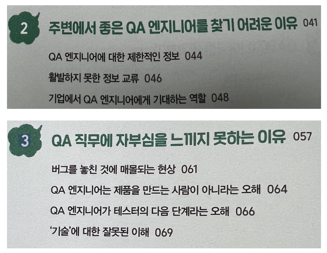 · QA엔지니어가 주변에 좋은 분들이 만나기 어려운 이유 및 QA직무에 자부심을 느끼지 못하는 이유등에 대해서 2,3장에서 설명을 합니다