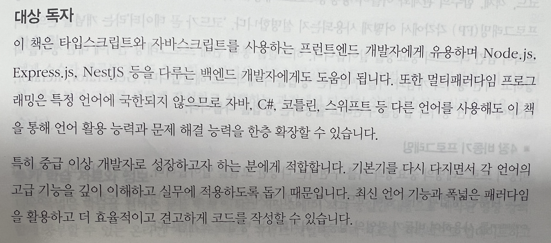 · 언어의 구문 차이만 있지 이제는 언어의 특성이 점차 사라지고, 각각의 장점이 반영되고 있어서 이 시점에 그러한 경계선에서 어떠한 부분을 주의하고 신경써야 하는지 알려주는 책이 나온것 같습니다.