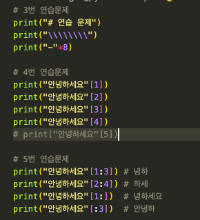 문자열 선택 : 문자열[0], 문자열[1:5] // 0부터 시작, 마지막 숫자 index내용 포함하지 않음