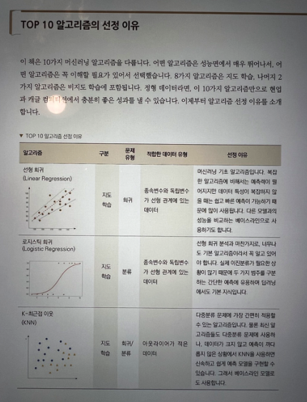 책에서 선정한 10개의 알고리즘 (8개의 지도 학습, 2개의 비지도 학습) 으로 구성되어 있습니다.