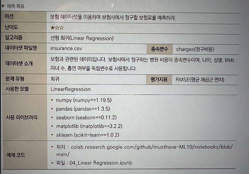 해당 미션을 보면, 앞에서 다루었던 "보험료 청구 예측" 하는 데이터 샘플과 비슷하다고 생각이 들것입니다.